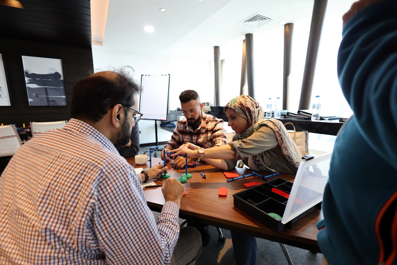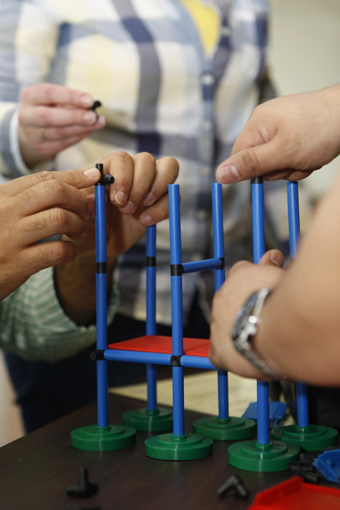 In "Carts and Horses," teams design and replicate models through verbal communication only—no writing or drawing. The task tests clarity, collaboration, and communication under constraints.